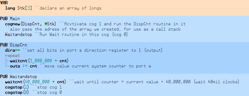 An example program, (as it would appear in the "Propeller Tool" editor) which outputs the current system counter every 3,000,000 cycles, then is shut down by another cog after 40,000,000 cycles: