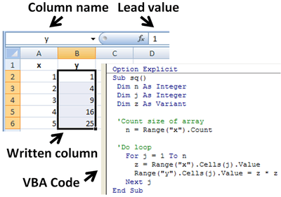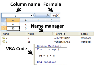 Use of named column variables x & y in Microsoft Excel. Formula for y=x2 resembles Fortran, and Name Manager shows the definitions of x & y.