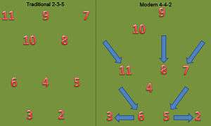 In England, in a now traditional 4–4–2 formation, the standard numbering is usually: 2 (right fullback), 5, 6, 3 (left fullback); 4 (defensive midfielder), 7 (right midfielder), 8 (central/attacking midfielder), 11 (left midfielder); 10 (second/support striker), 9 (striker). This came about based on the traditional 2–3–5 system. Where the 2 fullbacks retained the numbers 2, 3. Then of the halves, 4 was kept as the central defensive midfielder, while 5 and 6 were moved backward to be in the central of defence. 7 and 11 stayed as the wide attacking players, whilst 8 dropped back a little from inside forward to a (sometimes attacking) midfield role, and 10 stayed as a second striker in support of a 'number 9'. The 4 is generally the holding midfielder, as through the formation evolution it was often used for the sweeper or libero position. This position defended behind the central defenders, but attacked in front – feeding the midfield. It is generally not used today, and developed into the holding midfielder role.