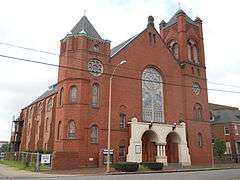 The historic church building was built in 1888, a red brick structure in the Richardsonian Romanesque style with a large, heavy and steeply pitched slate roof and two flanking towers. The building features a centered stone entrance portico, containing the main entrance to the church. The portico is built of light grey freestone in a style reminiscent of the ambulatory of a Romanesque abbey and consists of two large openings headed by semi-circular arches. The building houses a large sanctuary and horseshoe-shaped balcony with a seating capacity of 1,500 people. Also on the property is the contributing parsonage; a 2½-story, four-bay, brick dwelling in a simplified Second French Empire style.[4] It was listed on the National Register of Historic Places in 1986.[1]