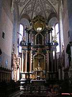 The Collegiate Church of St. Lawrence (Ukrainian: Костел святого Лаврентія у Жовкві; Polish: kolegiata św. Wawrzyńca w Żółkwi) is the main Roman Catholic church of Zhovkva, Ukraine. It was built between 1606 and 1618 as the pantheon of the Polish commander Stanisław Żółkiewski and his family.