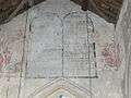 The interior of the church contains wall paintings dating from the 13th to the early 19th centuries,[2] some of which are illustrated in Professor E. W. Tristram's English Wall Painting of the Fourteenth Century.[23] Tristram notes that fragments of a reredos survive with paintings of four saints on them,[24] and he also comments on "crosses of rather elaborate design".[25] Some wall paintings are on crumbling plaster behind painted post-Reformation texts,[17] in places the paint is up to seven layers thick. There are 15th-century angels above the chancel arch and an early 14th-century Doom on the east wall of the north aisle. Victorian texts include the Ten commandments, the Apostles' Creed and the Lord's Prayer.[26] Restoration work on the paintings in 2010 led to access to the church being restricted.[2][27]