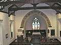Further restoration work, which included the eastern extension of the chancel and vestry and the insertion of the bench seating, was completed by R.J.Withers in 1865 at a cost of £460. The original east wall of the church was cut through and the plain yellow sandstone chancel arch erected; the stonework was designed and executed by Edward Jones of Newtown. The round headed windows were also altered to the Gothic style and stained glass windows have been inserted, including one by William Morris and Co.
