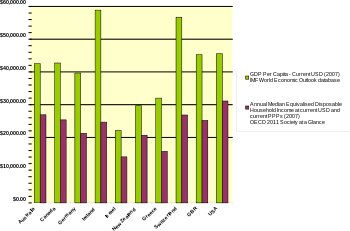 In 2006, median income was $43,318 per household ($26,000 per household member)[1] with 42% of households having two income earners.[46] Meanwhile, the median income of the average American age 25+ was roughly $32,000[2] ($39,000 if only counting those employed full-time between the ages of 25 to 64) in 2005.[3] According to the CIA the gini index which measures income inequality (the higher the less equal the income distribution) was clocked at 45.0 in 2005,[47] compared to 32.0 in the European Union[48] and 28.3 in Germany.[49]