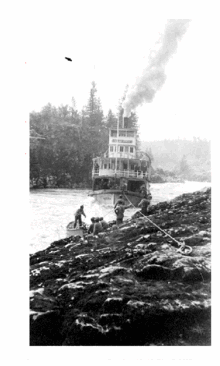 When the Omineca Gold Rush began in 1869, it became profitable to attempt navigation on the Skeena again. The Omineca diggings could be easily reached from Hazelton, where a trail ran for 115 miles (185 km), passing Fort Babine and Takla Lake. At first, canoes were used to ship the supplies from the coast. Captain William Moore was under contract with the Hudson’s Bay Company (HBC) to perform this service, and Robert Cunningham traded as an independent. This was gruelling and perilous work, as well as slow and expensive. The HBC decided in 1889 to build a sternwheeler, the Caledonia, and hired Captain George Odin to be her pilot. She was launched on February 28, 1891, at New Westminster and made her first trip to Hazelton that May, taking nine days to make the trip. The Caledonia was considered a success and began serving not only the Skeena River, but also the northern coastal regions. Captain John Bonser was hired on to be her captain, and in 1895 the Caledonia was overhauled and lengthened at his request, making her more manoeuvrable.
