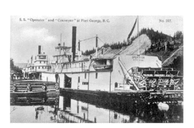 When the Grand Trunk Pacific Railway reached Tête Jaune Cache in 1912, they were able to use their own sternwheelers to transport workers and supplies up and down the river. The Operator and the Conveyor had worked on the Skeena River and were dismantled at Victoria. Their machinery and boilers were hauled up by rail to Jasper, Alberta and then hauled by mule wagon to Tête Jaune Cache where they were reassembled for use on the stretch of the river between there and Fort George. Their captains were Captain 'Con' Myers and Captain Jack Shannon, respectively. When their work was completed their machinery was recycled and the hulls were left at the shore of the Fraser River near Prince George.[1]