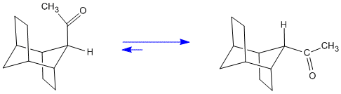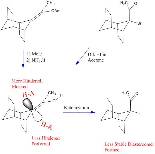 Protonation from the less hindered face of an enol leads to the less stable of two, a priori, diastereomers. In this example[6] there are two different reactions which afford the enol as a transient intermediate. One is the treatment of an α-bromoketone with dilute HI in acetone. The second is the reaction of an enol acetate with methyllithium. The first of the two reactions is an example of microscopic reversibility. This is the reverse of bromination of a ketone, a reaction well-known to proceed via the enol as an intermediate. Interestingly this is an example with extreme stereoselectivity due to the severe steric hindrance of an ethano-bridge.