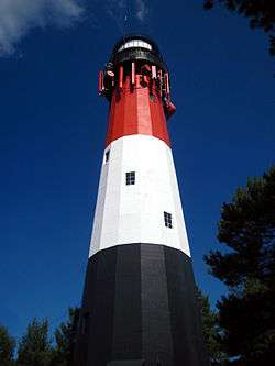 The lighthouse as built in between 1904-1906 by the plans of German architect Walter Körteg. The lighthouse was constructed out of a wooden frame, by the company Julius Pintsch from Berlin.[5] Formerly the lighthouse had a rotating beacon powered by 110 V. In 1926, the lighthouse had undergone modernisation, when the former light system was replaced by a light bulb with the power of 2000 V, installing an additional emergency gas-powered system.[6] In 2006, on the lighthouse's one hundredth year of existence - the lighthouse had undergone a complete renovation; which included a new exterior paint-scheme; a characteristic of the lighthouse.[7]
