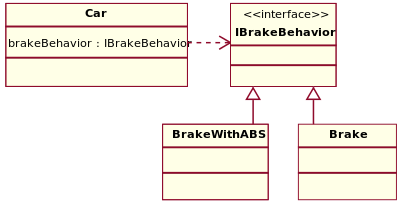 The strategy pattern uses composition instead of inheritance. In the strategy pattern, behaviors are defined as separate interfaces and specific classes that implement these interfaces. This allows better decoupling between the behavior and the class that uses the behavior. The behavior can be changed without breaking the classes that use it, and the classes can switch between behaviors by changing the specific implementation used without requiring any significant code changes. Behaviors can also be changed at run-time as well as at design-time. For instance, a car object’s brake behavior can be changed from BrakeWithABS() to Brake() by changing the brakeBehavior member to: