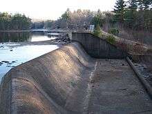 Created near the top of Turkey Hill, the Sugden Reservoir Dam impounds the waters of Shaw Brook and Turkey Hill Creek creating the Sugden Reservoir for waterpower storage. This waterpower supplied industry in both the Upper and Lower Wire Village, sections of North Spencer, Massachusetts. .[1] The first wire-making industry in the country used this watershed for waterpower. Owned first by the Prouty Brothers (a famous Spencer Family), a wire mill that became Wickwire-Spencer, was purchased by Richard Sugden who improved the mills by creating the Sugden Reservoir in 1882. At one time, Spencer had eleven factories and twenty-six buildings for wire drawing along Turkey Hill Creek and the Seven Mile River.[2] Never used for potable water, this reservoir provided only industrial waterpower storage. The energy storage was considerable because of the high elevation of this reservoir relative to the mouth of Turkey Creek where it enters the Seven Mile River.