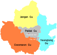 The newest of these is Yeongtong-gu, which was separated from Paldal-gu on November 24, 2003.[14] These districts are in turn divided into 42 dong.[15]