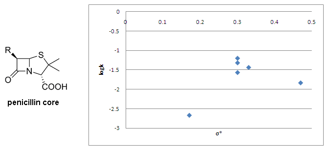 The Taft equation is often employed in biological chemistry and medicinal chemistry for the development of quantitative structure activity relationships (QSAR). In a recent example, Sandri and co-workers[12] have used Taft plots in studies of polar effects in the aminolysis of β-lactams. They have looked at the binding of β-lactams to a poly(ethyleneimine) polymer, which functions as a simple mimic for human serum albumin (HSA). The formation of a covalent bond between penicillins and HSA as a result of aminolysis with lysine residues is believed to be involved in penicillin allergies. As a part of their mechanistic studies Sandri and co-workers plotted the rate of aminolysis versus calculated σ* values for 6 penicillins and found no correlation, suggesting that the rate is influenced by other effects in addition to polar and steric effects