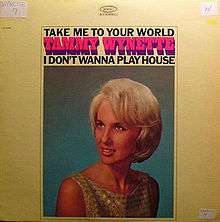 Take Me to Your World / I Don't Wanna Play House is the second studio album by American country music singer Tammy Wynette. It was released in 1968 and it was produced by Billy Sherrill and engineered by Tom Sparkman. It reached number 3 on the Billboard Country Albums chart. The singles "Take Me to Your World" and "I Don't Want to Play House" both reached the number one spot on the Country Singles chart.[2] As was fairly common at the time for female country artists, the album contained both new material, as well as covers of songs that had been recent hits for others (e.g. Bobbie Gentry's "Ode to Billie Joe", and "Jackson Ain't a Very Big Town", originally a 1967 top-40 country single for Norma Jean).