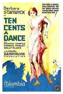 Ten Cents a Dance is a 1931 American Pre-Code romance-drama film directed by Lionel Barrymore and starring Barbara Stanwyck as a married taxi dancer who falls in love with one of her customers. The film was inspired by the popular song of the same name, which is sung over the title sequence.[1]
