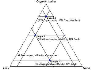 | Sample 3 | 10% | 40% | 50% | This sample has the same proportion of clay as in Sample 2 does, but because it has a smaller proportion of organic matter, the proportion of sand must be larger, because all samples' proportions must sum to 100%. |