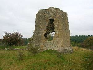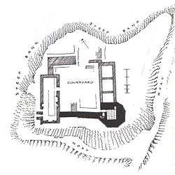 The small, irregular, octangular 14th century vaulted tower has a splayed base[4][5] and is constructed of courses of square ashlar masonry,[6] 6 m (20 ft) high, with walls 2.0m thick, is the earliest part of the structure, together with the wide wall at the north-west. The tower was vaulted, with three ribs, and an entrance from the courtyard via a narrow passage leading to a partly surviving wheel-stair.[4] The remains of outbuildings lie to the north and a well was recorded within the keep; a sizeable courtyard lay within the complex.[7] The remains have seen some restoration[8] and the lines of excavation trenches are apparent. The whereabouts of the records of the late 19th century excavations is not known for certain.[9]