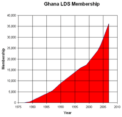 As of January 1, 2014, The Church of Jesus Christ of Latter-day Saints reported 62,031 members, thirteen stakes and 9 districts, 207 congregations (102 wards, 105 branches),[1] four missions, and one temple in Ghana.[2]