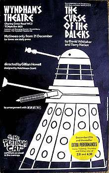 The Curse Of The Daleks is a Dalek stage play, written by David Whitaker and Terry Nation, which appeared for one month at the Wyndham's Theatre in London beginning 21 December 1965. It is notable for being Terry Nation's first live action attempt to exercise his ownership of the Dalek concept independently of the BBC. As such, it does not include the character of the Doctor, the TARDIS or any other elements from the Doctor Who television series. Produced by John Gale and Ernest Hecht, and directed by Gillian Howell, it was performed mostly as a matinée indicating that children were the intended primary audience.