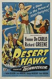 The Desert Hawk is a 1950 fantasy adventure film starring Yvonne De Carlo, Richard Greene, Jackie Gleason, and Rock Hudson.