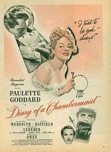 The Diary of a Chambermaid (1946) is a drama film about a newly hired servant who severely disrupts a wealthy family. The film was based on the novel of the same name by Octave Mirbeau and the play Le journal d'une femme de Chambre, written by André de Lorde, with André Heuse and Thielly Nores. The film was directed by Jean Renoir, and starred Paulette Goddard, Burgess Meredith, Hurd Hatfield, and Francis Lederer. It was named the eighth best English-language film of 1946 by the National Board of Review.[1]