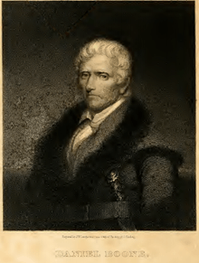 Filson's appendix includes an account of the life and adventures of Daniel Boone, a man whose adventures and exploration attained him fame. In his lifetime, Boone founded Boonesborough, Kentucky, maintained position as a militia officer during the Revolutionary War, and worked as a merchant and surveyor.[1]
