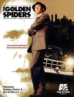 The Golden Spiders: A Nero Wolfe Mystery is a 2000 made-for-television film based on the 1953 novel by Rex Stout. Set in 1950s Manhattan, the A&E Network production stars Maury Chaykin as the heavyweight detective genius Nero Wolfe, and Timothy Hutton as Wolfe's assistant, Archie Goodwin, narrator of the Nero Wolfe stories. Veteran screenwriter Paul Monash adapted the 1953 novel by Rex Stout; Bill Duke directed. When it first aired on the A&E Network March 5, 2000, The Golden Spiders was seen in 3.2 million homes, making it the fourth most-watched A&E original movie ever.[1] Its success led to the A&E original series, A Nero Wolfe Mystery (2001–2002).