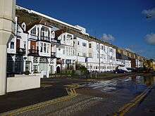 The Granville Marina, Ramsgate, Kent. This was originally a parade of small shops, tea rooms and houses built in 1877 in the Old English style. The site is reached by Marina Road from Victoria Parade. The Marina formed part of the Granville Hotel, Ramsgate complex planned by Edmund Francis Davis. The buildings also included a large hall on the western end Marina Hall - since demolished. The buildings are partly built into the chalk cliffs below the former hotel.