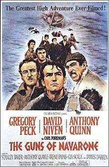 The Guns of Navarone is a 1961 British-American epic adventure war film directed by J. Lee Thompson. The screenplay by producer Carl Foreman was based on Alistair MacLean's 1957 novel The Guns of Navarone, which was inspired by the Battle of Leros during the Dodecanese Campaign of World War II. The film stars Gregory Peck, David Niven and Anthony Quinn, along with Stanley Baker and Anthony Quayle. The book and the film share the same basic plot: the efforts of an Allied commando team to destroy a seemingly impregnable German fortress that threatens Allied naval ships in the Aegean Sea, and prevents 2,000 isolated British troops from being rescued.