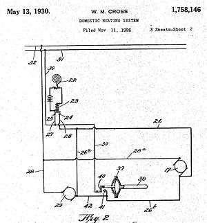 Walter M. Cross invented a hot-air furnace system with three main elements: (1) a motor driven stoker for feeding fuel to the combustion chamber of a furnace, (2) a room thermostatic switch for controlling the feeding of fuel, and (3) a combustion stoker switch to prevent the fire's going out in warm weather not requiring domestic heating. The room thermostat the supply of heat, or discontinues its supply, by closing or opening the circuit to the stoker motor at the required temperatures. The combustion stoker switch, or holdfire control, responds to a low temperature in the furnace by causing the stoker to feed fuel so as to prevent the furnace fire from going out. The control of the combustion stoker switch is effective in mild weather when the room thermostat may not call for heat for a considerable period.[8]