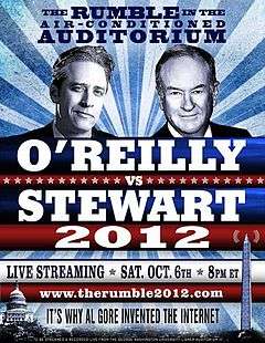 The Rumble in the Air-Conditioned Auditorium: O'Reilly vs. Stewart 2012 was a debate between Bill O'Reilly of The O'Reilly Factor and Jon Stewart of The Daily Show and moderated by CNN news anchor E. D. Hill. It took place on October 6, 2012 in Washington, D.C., starting at 8 pm with most of its audience viewing via Internet stream and subsequent download.[1] According to The New York Times, O'Reilly and Stewart "have been guests on each other’s programs since 2001" but "rarely agree on anything except their mutual respect for each other."[2]