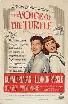 The Voice of the Turtle (1947) is a comedy film starring Ronald Reagan, Eleanor Parker, Eve Arden, and Wayne Morris, directed by Irving Rapper, and based on the long-running 1943 play of the same name by John Van Druten.[2]