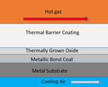 Thermal barrier coatings (TBC) are highly advanced materials systems usually applied to metallic surfaces, such as on gas turbine or aero-engine parts, operating at elevated temperatures, as a form of exhaust heat management. These 100 μm to 2 mm coatings serve to insulate components from large and prolonged heat loads by utilizing thermally insulating materials which can sustain an appreciable temperature difference between the load-bearing alloys and the coating surface.[1] In doing so, these coatings can allow for higher operating temperatures while limiting the thermal exposure of structural components, extending part life by reducing oxidation and thermal fatigue. In conjunction with active film cooling, TBCs permit working fluid temperatures higher than the melting point of the metal airfoil in some turbine applications. Due to increasing demand for higher engine operation (efficiency increases at higher temperatures), better durability/lifetime, and thinner coatings to reduce parasitic weight for rotating/moving components, there is great motivation to develop new and advanced TBCs.