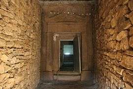The Thracian tomb Griffins, found in Bulgaria, has a façade decorated with plastic columns and with a pediment above them. The pediment`s ends are semi-palmettes, the lower leaves of which are elongated and look like heads of griffins. The temple was built in the 5th century BC. There is a corridor made from river stones, floored with earth. The façade, the antechamber and the circular chamber are built of granite blocks. The entrances to the antechamber and the dome chamber had been closed by stone doors which were found broken during the research of the facility. The antechamber is of rectangular shape and has a double-pitched roof. The round chamber is covered with fine-made dome. The floors of both rooms are made of plastered granite slabs. Opposite the entrance of the circular chamber is situated a ritual stone bed with decorations. On a stone block in front of the bed were found gold paws. A funeral took place in the temple in the 4th century BC. The corridor was filled with river stones and soil. It was robbed in antiquity.