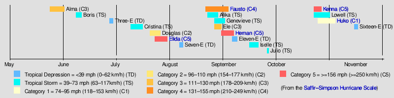 The season produced nineteen tropical depressions, of which fifteen intensified into tropical storms, eight became hurricanes, and six became major hurricanes. While many tropical cyclones affected land during the season, Hurricane Kenna produced the most damage and loss of life. The third most powerful hurricane ever recorded in the East Pacific, Kenna reached maximum sustained winds of 165 mph (270 km/h), but weakened to a minimal Category 4 on the Saffir–Simpson Hurricane Wind Scale by the time the system moved ashore.