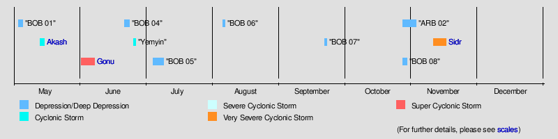 The graphical bar above gives a brief overview of storm activity during the season, and a storm's maximum intensity category in terms of wind speed is included as a colour bar. This is given by the IMD's values of maximum 10-minute sustained winds. The colour scheme is detailed to the right.