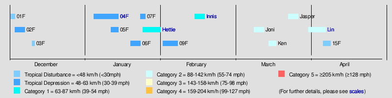 For the fourth season in a row tropical cyclone activity in the South Pacific was below its climatological average of nine tropical cyclones, with only six tropical cyclones occurring within the region. The most damaging tropical disturbance was Tropical Depression 04F which also was the deadliest tropical disturbance occurring during the season. The depression caused $45 million (2009 USD; $49.7 million 2016 USD) in damage and killed twelve people when it caused the worst economic natural disaster in Viti Levu since the drought of 1998.[1]