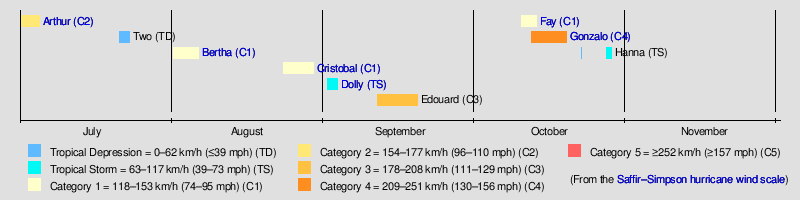The season featured nine tropical cyclones, of which eight further intensified into tropical storms and six further intensified into hurricanes (including two major hurricanes).[nb 2] Impact throughout the year was widespread. In early July, Hurricane Arthur moved ashore near Cape Lookout, North Carolina, resulting in minor damage and one indirect death.[5][6] In August, hurricanes Bertha and Cristobal moved across the southwestern Atlantic, causing minimal damage and several fatalities.[7][8] In September, Tropical Storm Dolly moved ashore the coastline of eastern Mexico, killing one and inflicting unsubstantial damage,[9] while Hurricane Edouard created large swells that impacted the East Coast of the United States and killed two people.[10][11] In October, hurricanes Fay and Gonzalo moved ashore Bermuda, marking the first time more than one tropical cyclone made landfall on the island in a single season on record.[12] Hanna impacted Central America later that month but caused no damage.