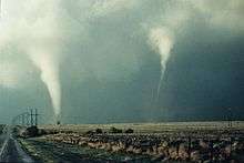 A tornado family is a series of tornadoes spawned by the same supercell thunderstorm.[1] These families form a line of successive or parallel tornado paths and can cover a short span or a vast distance. Tornado families are sometimes mistaken as a single continuous tornado, especially prior to the 1970s. Sometimes the tornado tracks can overlap and expert analysis is necessary to determine whether or not damage was created by a family or a single tornado.[2] In some cases, such as the Hesston-Goessel, Kansas tornadoes of March 1990, different tornadoes of a tornado family merge, making discerning whether an event was continuous or not more difficult.[3]