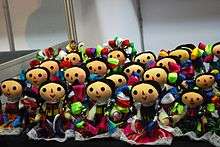 One important category of toys is that of dolls. They have been made from various materials and some have become iconic. Oaxaca is famous for rag dogs dressed in local indigenous dress.[24] In Mexico City, dolls called “Marías” are also made from cloth and dressed to imitate indigenous women. These often carry babies and are also adorned with ribbons and fringe/lace.[24] María dolls are well known among tourists in Mexico, even if they do not know what they are called. The dolls are made of cloth and are dressed similar to the traditional dress of Mazahua women, an indigenous group found in the State of Mexico and Michoacán. They are often sold on the street by women who make them. The filling is a material called guata, which is designed for the purpose. Culturally they are important because they present a traditional Mexican image, in contrast to commercially made dolls.[25] Lesser known are cartonería, or Lupita dolls, which are of a very hard paper mache. They were originally created to imitate expensive porcelain dolls from Europe.[11][15] Another European style “doll” are marionettes. Traditional marionettes are made in Puebla using brightly colored cloth for the body and appendages, but the hands, feet and head made of ceramic. Generally, these depict witches, bullfighters, devils, horses and clowns as well as famous characters such as Don Juan Tenorio and Doña Inés.[24] Marionettes were staples of puppet shows, which often were performed by roaming individuals or groups at local fairs and parties and miniature home puppet theaters became popular in the 19th century and remained so until the mid 20th century. They were also used for teaching Catholic doctrine to children. In the early 20th century, these marionettes also included more modern and international characters such as Popeye, Charlie Chaplin, Cantinflas and soldiers.[11] Corn husks are used in a variety of ways, including in the making of crafts like toys. Many are used to make small dolls. The husks are wrapped around bunched grasses, a corncob, or bamboo. After assembly the pieces are brightly painted with aniline dyes.[26]
