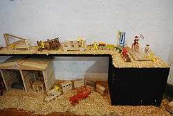 When Barbie was introduced to Mexico, it quickly replaced the traditional dolls, such as the Lupita dolls made of cartonería.[16] However, there are various artisans who still make dolls from various materials by hand, often updating designs. Blanca Molina designs about fifty different kinds of dolls each year, and herself makes about 200 that are generally sold in specialty stores.[27] Ana Karen Allende is a doll maker in Mexico City, whose works include traditional forms but her most popular items include male and female lucha libre wrestlers as well as aluxes, chaneques, calacas, and Mayan guardian figures. Each creation is unique with no two exactly alike.[28][29] The Miss Lupita project, headed by Carolina Esparragoza received government funding to hold workshops and other events with the aim of reviving the tradition of making the dolls in Mexico City, with new designs.[30] The most common traditional toy still made are miniatures, generally reproductions of real world people, creatures, and objects, sold as collectibles.[31][32] They have toy bows and arrows, cooking utensils, other tools.[2] They made in a wide variety of materials including clay, wood, metal.[31] They can be sold individually or in sets, generally to depict social scenes such as weddings, bullfights, battles, baptisms, and more.[31] One important creator of miniatures was Angel Carranza, born in Tlaquepaque in 1901, whose work is mostly done in glass. These include sets that recreate weddings, baptisms, market scenes, bullfights, charreadas as well as Nativity scenes.[32] Mexican toys are also often rich in ethnographic information. Miniature market scenes, similar to those made by the Aguilar family in Ocotlán, Oaxaca, and ceramic bands from Michoacán and Guerrero are often models of real-life equivalents, thereby making them invaluable tools for a better understanding of Mexican culture.[11] Specialty miniatures include musical instruments from Ixmiquilpan, miniatures in glass from Toluca and Guadalajara, miniatures woven from palm fronds in Chigmecatitlan, and those carved from peach and other pits in the form of animals.[31] A number of toys were associated with certain festival, with a few remaining today. Ones that are no longer commonly made for this purpose include cartonería masks for Carnival and a small mule made of palm fronds for Corpus Christi. These were sold outside of churches on that day, complete with baskets carrying miniature fruits and vegetables.[10][33] Among those that can still be found (though many have been replaced by plastic versions) include rachets, whistles, and cardboard periscopes for Holy Week .[1] Horns for Independence Day were once made of cartoneria, decorated in the national colors with a wood mouthpiece, but these are now mostly plastic.[33] Two that remain are the Judas figure for Holy Saturday and piñatas, originally used to celebrate Las Posadas but now also used for birthdays and other special occasions. Both are filled with candy for children to grab when they are broken. However, the Judas figure (often in the form of a devil or an unpopular personality) is destroyed by fireworks attached to its body. The piñata is broken by blindfolded children who take turns hitting it with a stick.[34]