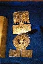 In the pre Hispanic period, metals were used to create needles, punches, tweezers, weapons and musical instrument but its most important uses, especially gold and silver, was as jewelry for the social elite and as offerings to the gods.[2][7][8] Gold and silver were worked by hammering, plating and molds the blending of these and some casting was known.[2][4][9] One pre Hispanic technique was to hammer metal flat, punch out a design and then layer this design over wood or leather, often used on shields.[9] Silver was less used in the pre Hispanic period as it was less valued as tribute. It did not have the same divine symbolic value that gold did.[7] The use of copper was almost exclusive to the Purépecha Empire in what is now Michoacán when the Spanish arrived. Copper instruments included axes, hoes, scythes, punches, chisels, needles, pins, arrowheads, brooches, canes, handles, helmets, shields and small bells.[4]