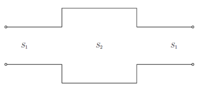 The low-frequency approximation implies that each subsystem is an acoustic two-port (or four-pole system) with two (and only two) unknown parameters, the complex amplitudes of two interfering waves travelling in opposite directions. Such a system can be described by its transmission matrix (or four-pole matrix), as follows[2]
