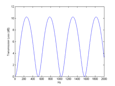 As a simple example, consider a one chamber silencer with h=S1/S2=1/3, at around 400 °C the sound speed is about 520 m/s, with l=0.5 m, one easily calculate the TL result shown on the plot on the right. Note that the TL equals zero when frequency is a multiple of and TL peaks when frequency is .