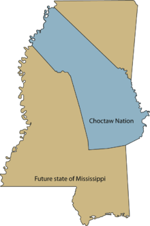Around 15,000 Choctaws left the old Choctaw Nation for the Indian Territory – much of the state of Oklahoma today.[1] The Choctaw word Oklahoma means "red people".