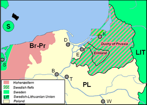 Hard-pressed himself by several countries entering the war against him, Charles X Gustav in January 1656 agreed with Frederick William I on the Treaty of Labiau, which altered the terms of Königsberg in a way that the Hohenzollern electors were freed of Swedish vassalage for the Prussian duchy at the cost of Ermland and a more active participation in the war.[12] In the subsequent treaties of Wehlau and Bromberg, John II Casimir confirmed Frederick William I's sovereignty in Prussia after the latter abandoned Sweden in the war.[13]