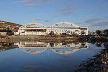 The airport was situated at Skattøra in what was then Tromsøysund Municipality, in today's Tromsø, some 6 kilometers (3.7 mi) north of the city center.[3] The predominant structure at the airport was the twin hangar building. It consists of two concrete arch triplets which carry the roof. Inside the hangar is split in two with a reinforced wall. The structure measures 2,000 square meters (22,000 sq ft).[40] There were two slipways, one falling down from the hangar and one further north.[44] There was a 63-meter (207 ft) pier which ran out from the airport, with a small building at the end.[45] A reinforced wall was built to protect aircraft from attack.[41]