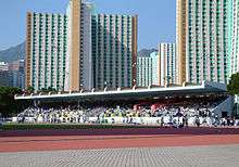![]() Tuen Mun Tang Shiu Kin Sports Ground's main grandstand, background is Tai Hing Estate | |