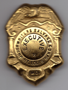The Underwriters Salvation Corps of St Louis was created in May 1874[1] to reduce the lost of property in fires. It was one of several Salvage Corps that formed in the 19th century to deal with fire in growing cities. Members would be part of Fire Patrols that, in the event of a fire, would enter burning structures and remove valuables before the fire could destroy them. This organization helped innovated early fire equipment. The organization "came to a close at the stroke of midnight on December 31, 1955"[2]