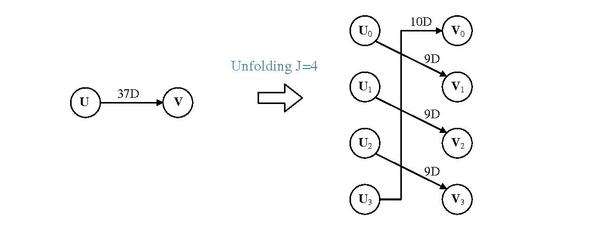 - For each edge U arrow → V with w delays in the original DFG, we create the edges on transformed graph by Ui arrow → V(i+w)%J with for i = 0, 1, ... J − 1.