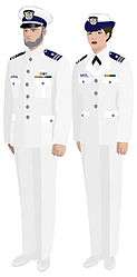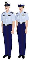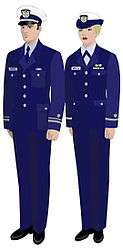 The uniforms of the United States Coast Guard Auxiliary serve to distinguish Auxiliarists from members of other civilian auxiliaries and of other armed services. Auxiliarists are expected to wear a uniform intended for the situation and mission.[1] Each auxiliary uniform is identical to a Coast Guard officer's military uniform, with the exception that the buttons and stripes on dress jackets and shoulder boards are silver in color, rather than gold. On dress uniforms, appointed staff officers wear insignia with a red "A" and elected officers wear insignia with a blue "A", while black "A"s are worn on insignia by both elected and appointed officers on the ODU uniform. Auxiliarists are expected to adhere to the same rules of correct uniform wear as regular Coast Guard officers. When augmenting Coast Guard personnel, the military-style insignia of Auxiliary position is generally removed and the organizational insignia is worn.